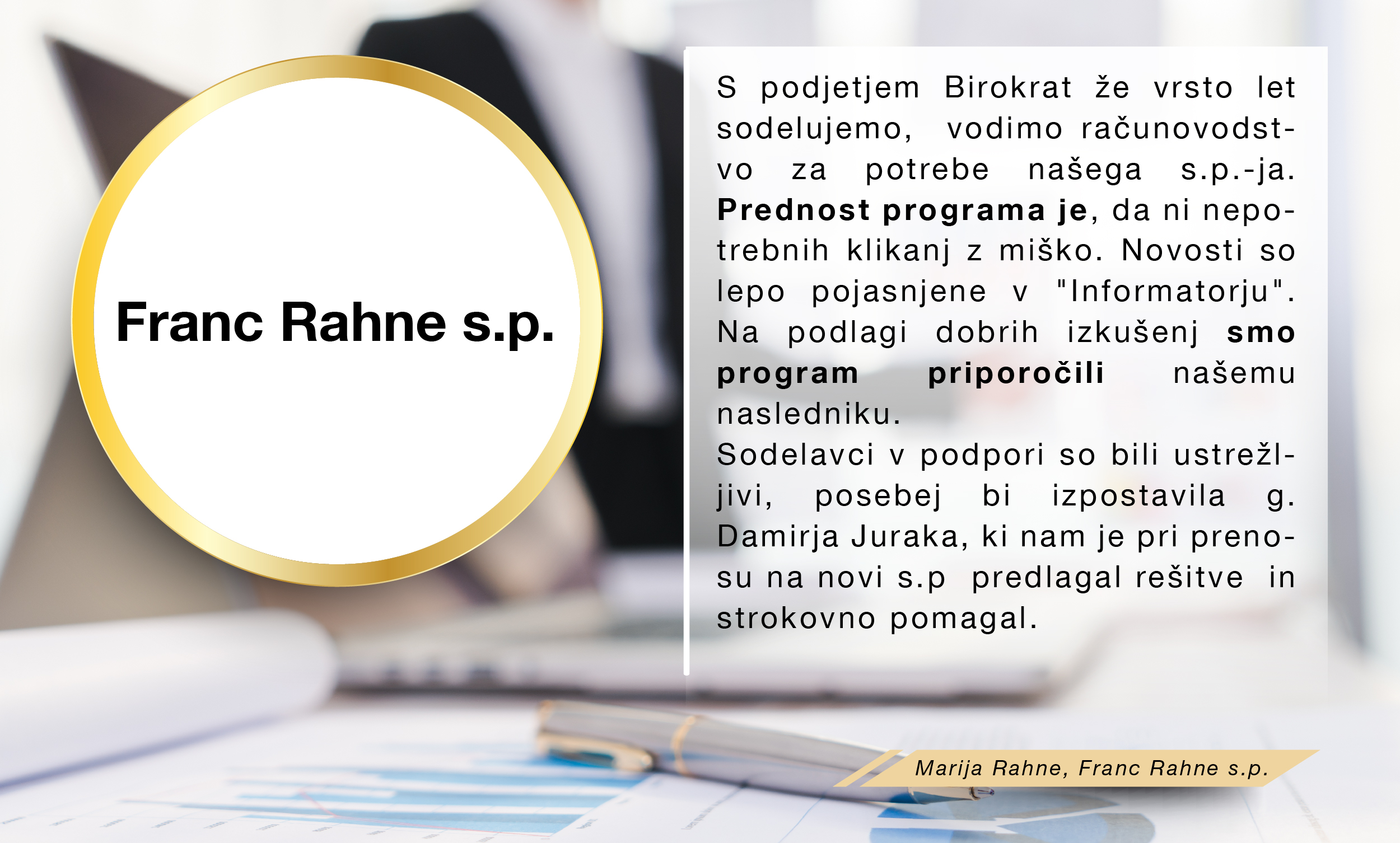 Med množico programov sem se odločila za program Birokrat, ker zajema vse, kar za svoje poslovanje potrebujem, ker je enostaven za uporabo, ko se ga navadiš in cenovno sprejemljiv. Ker je v podjetju zaposlenih kar nekaj strokovnjakov, ki redno spremljajo vse spremembe zakonodaje in v skladu s tem pripravljajo nadgradnje, me ne skrbi, da bi kaj pomembnega spregledala. In kar je zame najpomembnejše, je to, da če naletim na problem, ki ga ne znam sama rešiti, lahko pokličem in mi pomagajo na daljavo. Izjemno sem zadovoljna in hvaležna g.Juraku za vso podporo, kajti ravno on me je s svojo potrpežljivo razlago in demonstracijo prepričal, da je to pravi program zame, ki sem iz srednje generacije in nisem "otrok računalniške dobe".