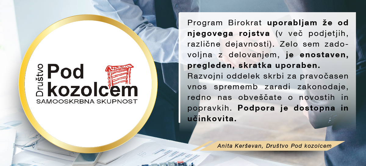 Vaš program Birokrat uporabljamo od leta 2010 in smo zelo zadovoljni z njim; je enostaven, dober in prijazen. Ga redno posodabljate in dopolnjujete z zakonskimi spremembami. Kadar koli smo potrebovali pomoč smo bili hitro in prijazno sprejeti od Vaših ljudi. Želimo si enak odnos tudi v prihodnje!