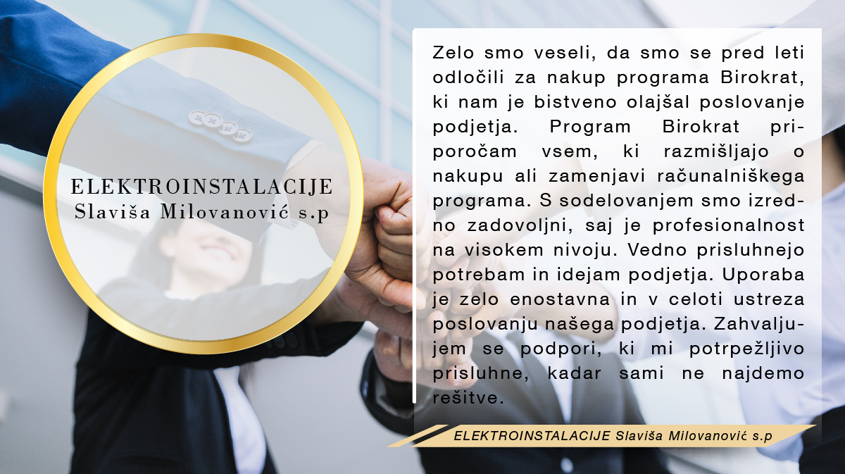 Program Birokrat uporabljamo že več kot 10 let in smo z njim zadovoljni. Uporaba je enostavna, zato je uvajanje novih sodelavcev hitro in učinkovito. Uporaba in vzpostavitev programa je cenovno ugodna. Program priporočamo vsem, ki želijo poenostaviti poslovanje.