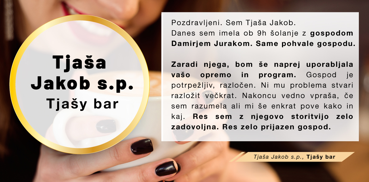 Iskreno se vam zahvaljujem za vso pomoč pri namestitvi programa in natančni in jasni razlagi kako zadeva deluje, predvsem pa za vašo potrpežljivost. Da ste mi dali neomejeno število možnosti, da vsakokrat preverim, če sem razumela in mi pri tem niste dajali občutka, da vam je to odveč ali da je z mano karkoli "narobe", ker "tega in tega" ne obvladam. Izjemno pozitivna izkušnja z delom z računalnikom. Prijetno presenečena.