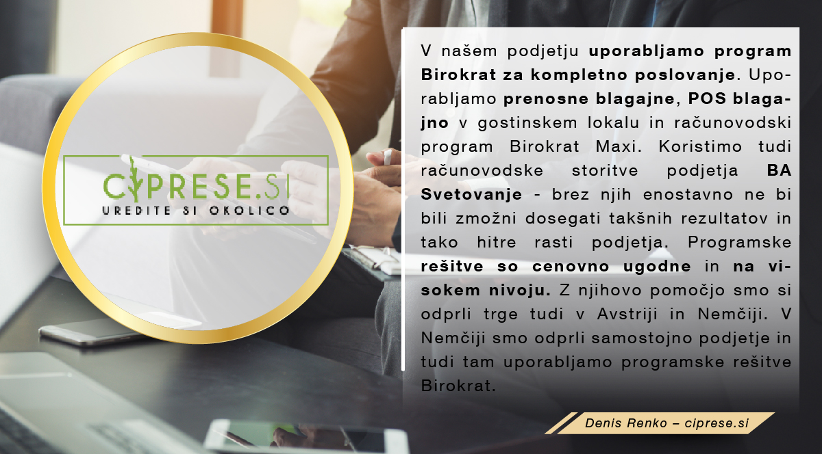 Program Birokrat uporabljamo že od leta 2001 in smo z njim zelo zadovoljni. Program je enostaven in prijazen za uporabo, je zanesljiv in ažurno dopolnjen z zakonskimi spremembami. Všeč nam je, ker ima veliko opcij, možnih načinov pregledov in analiz, ki jih stranke rabijo pri svojem nadaljnjem delu. Prav tako so tudi vsi zaposleni v podjetju prijazni in ažurni pri reševanju nastalih težav in problemov. Poleg vsega navedenega pa je program tudi cenovno ugoden in ga z veseljem priporočamo .