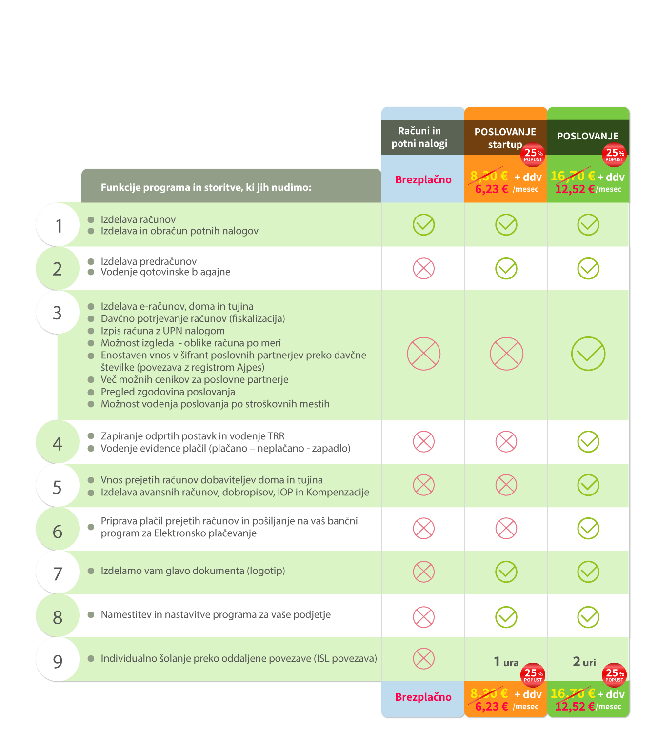 Za uporabnike, ki potrebujejo poleg računov in potnih nalogov še druge funkcionalnisti smo pripravili 2 paketa (Poslovanje startup in Poslovanje), ki ponujata veliko več možnosti kot brezplačna verzija za minimalni mesečni prispevek za vzdrževanje in posodobitve programov.