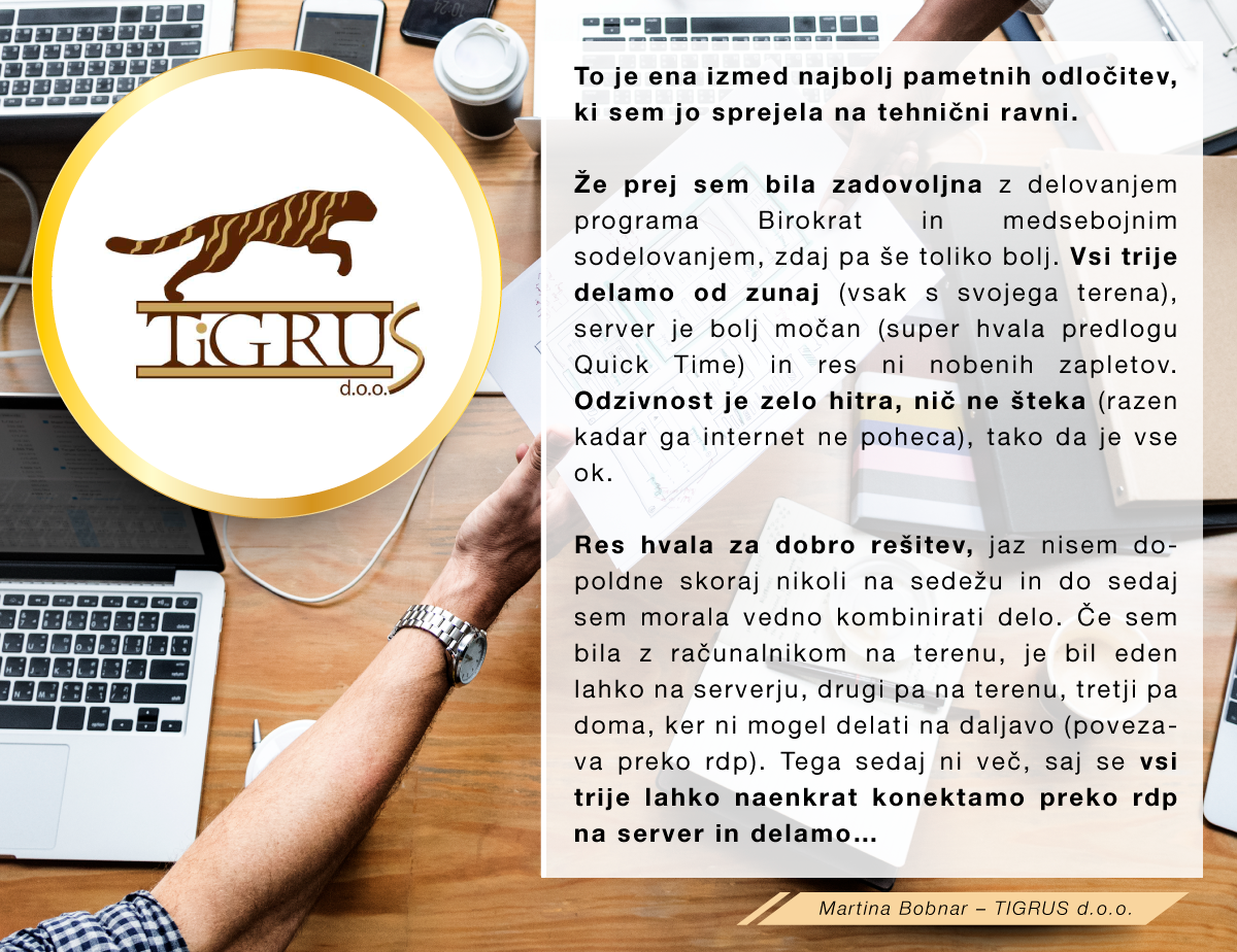 Program Birokrat uporabljamo že od l.2013. Z njim smo zadovoljni, saj je zelo enostaven za uporabo in tudi podpora je zelo odzivna na morebitna vprašanja. Veliko je avtomatike, tako da s tem pohitrimo marsikatero opravilo. Program smo sedaj prestavili v oblak. Zaradi zelo zmogljivega serverja, deluje še veliko hitreje in tako imamo več časa za druge stvari. Ker sem tudi veliko na terenu, mi program v oblaku olajša marsikatero opravilo, saj lahko do njega dostopam prek telefona ali tablice kadarkoli od koderkoli. Definitivno priporočam selitev programa v oblak.