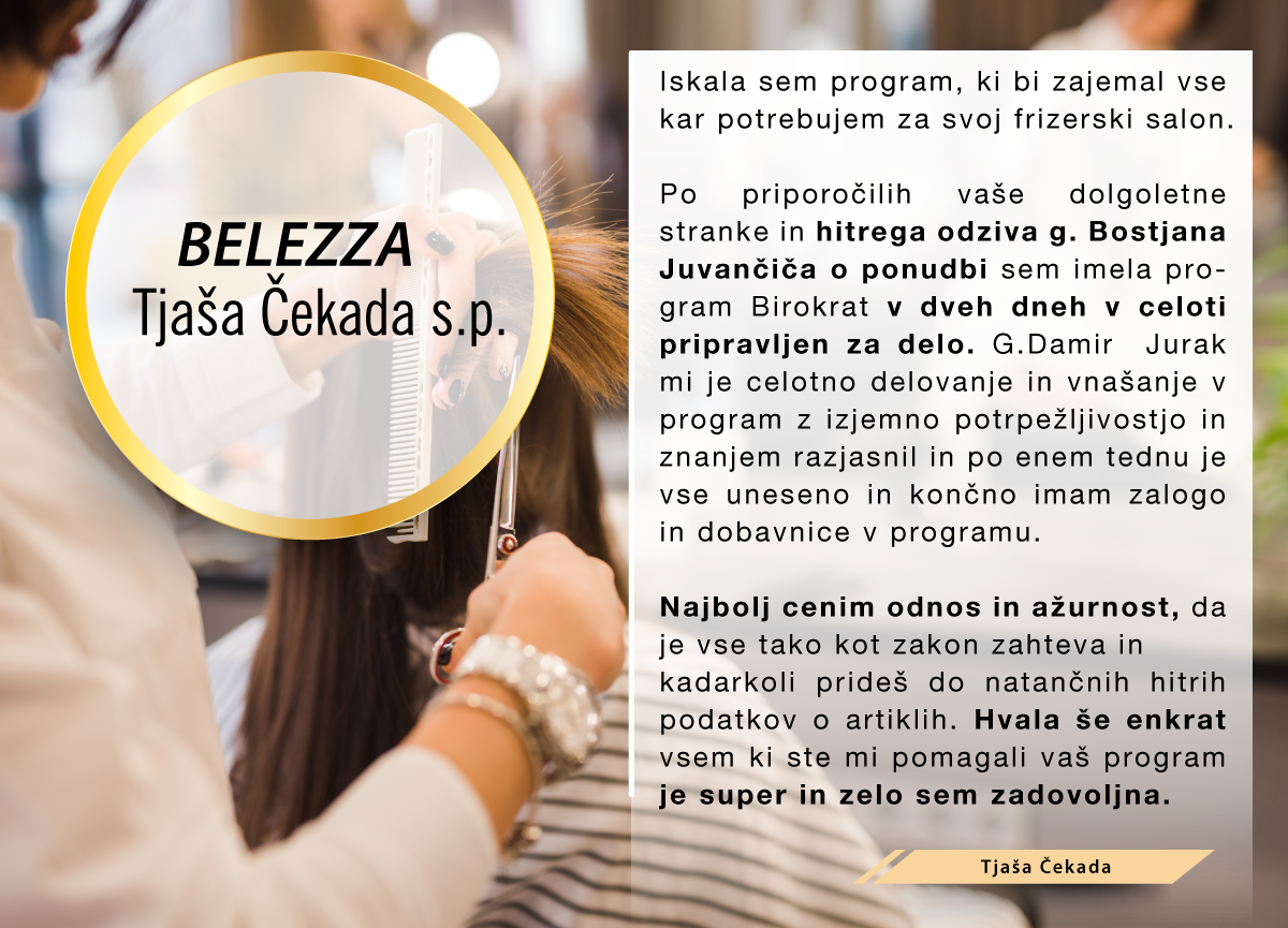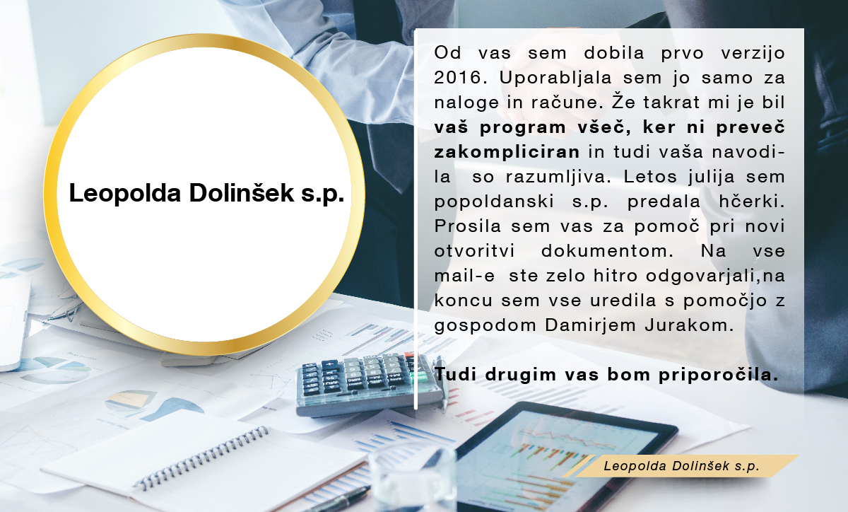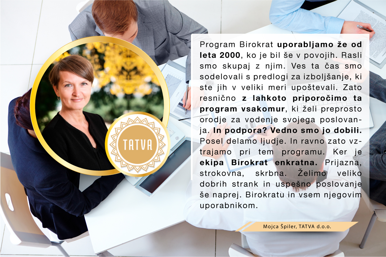 Med množico programov sem se odločila za program Birokrat, ker zajema vse, kar za svoje poslovanje potrebujem, ker je enostaven za uporabo, ko se ga navadiš in cenovno sprejemljiv. Ker je v podjetju zaposlenih kar nekaj strokovnjakov, ki redno spremljajo vse spremembe zakonodaje in v skladu s tem pripravljajo nadgradnje, me ne skrbi, da bi kaj pomembnega spregledala. In kar je zame najpomembnejše, je to, da če naletim na problem, ki ga ne znam sama rešiti, lahko pokličem in mi pomagajo na daljavo. Izjemno sem zadovoljna in hvaležna g.Juraku za vso podporo, kajti ravno on me je s svojo potrpežljivo razlago in demonstracijo prepričal, da je to pravi program zame, ki sem iz srednje generacije in nisem "otrok računalniške dobe".