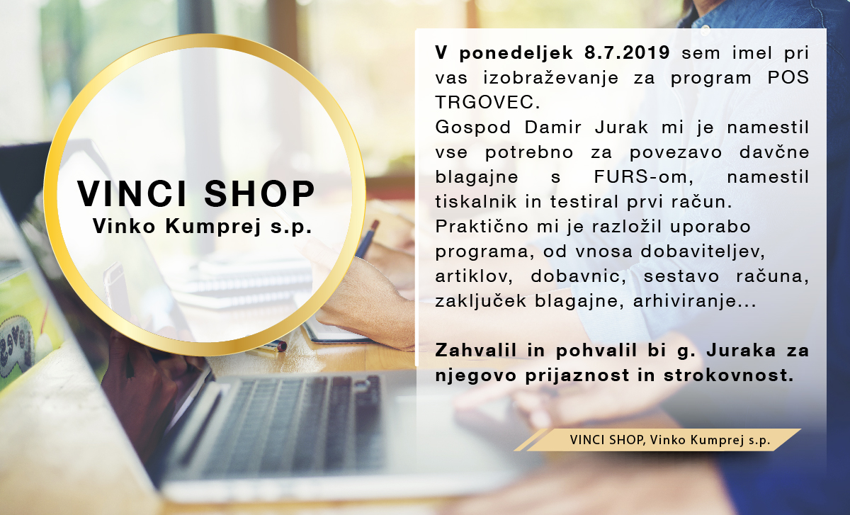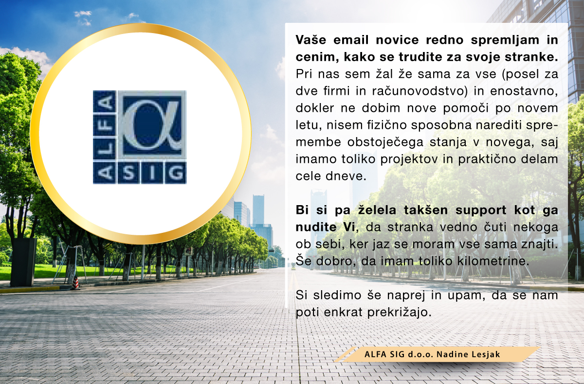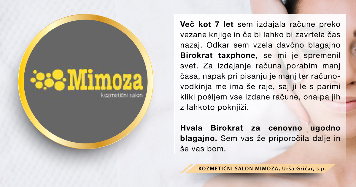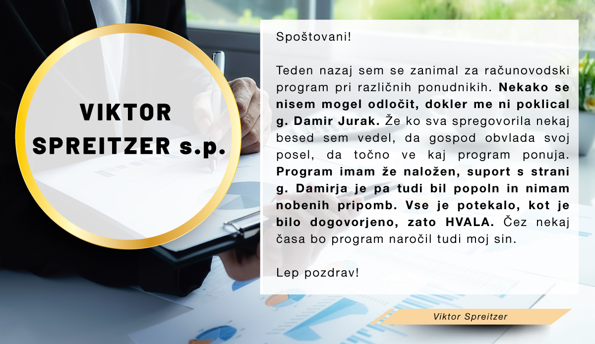 Med množico programov sem se odločila za program Birokrat, ker zajema vse, kar za svoje poslovanje potrebujem, ker je enostaven za uporabo, ko se ga navadiš in cenovno sprejemljiv. Ker je v podjetju zaposlenih kar nekaj strokovnjakov, ki redno spremljajo vse spremembe zakonodaje in v skladu s tem pripravljajo nadgradnje, me ne skrbi, da bi kaj pomembnega spregledala. In kar je zame najpomembnejše, je to, da če naletim na problem, ki ga ne znam sama rešiti, lahko pokličem in mi pomagajo na daljavo. Izjemno sem zadovoljna in hvaležna g.Juraku za vso podporo, kajti ravno on me je s svojo potrpežljivo razlago in demonstracijo prepričal, da je to pravi program zame, ki sem iz srednje generacije in nisem "otrok računalniške dobe".