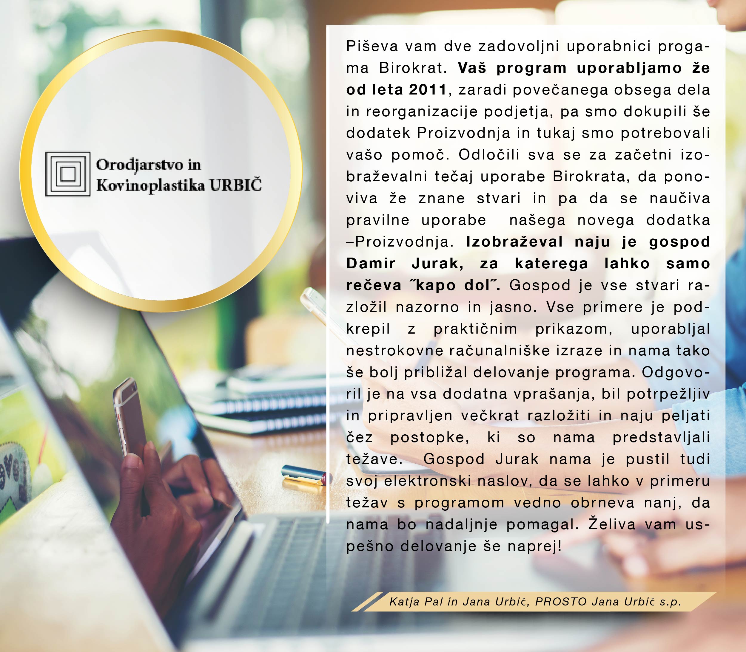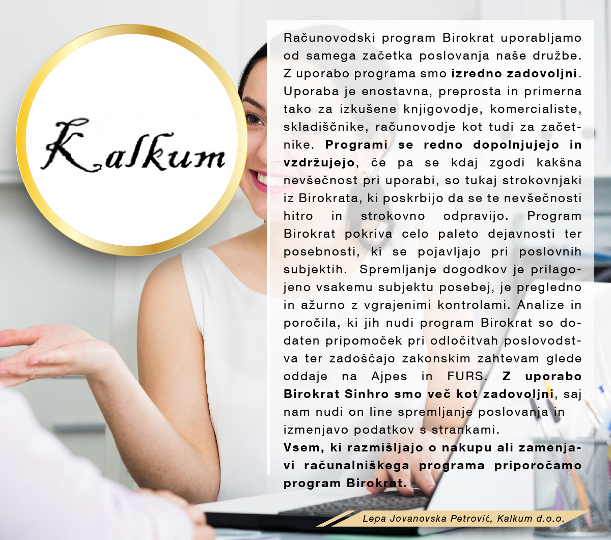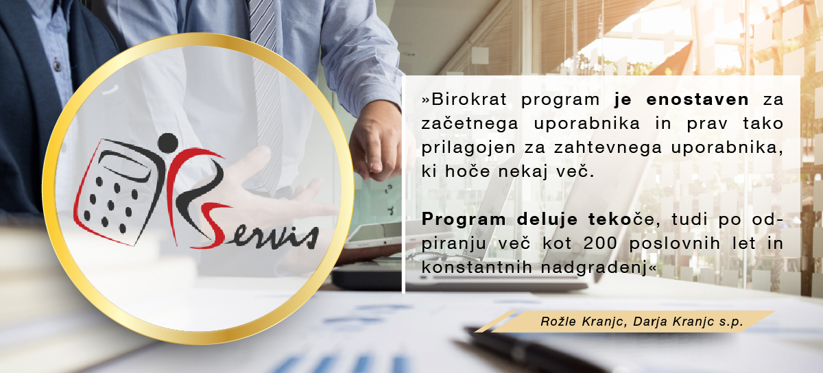 Program Birokrat uporabljamo že od  leta 2001 in smo z njim zelo zadovoljni. Program je  enostaven in prijazen za uporabo, je zanesljiv in ažurno dopolnjen z zakonskimi spremembami. Všeč nam je, ker ima veliko opcij, možnih načinov pregledov in analiz, ki jih stranke rabijo pri svojem nadaljnjem delu. Prav tako so tudi vsi zaposleni v podjetju prijazni in ažurni pri reševanju nastalih težav in problemov. Poleg vsega navedenega pa je program tudi cenovno ugoden in ga z veseljem priporočamo .
