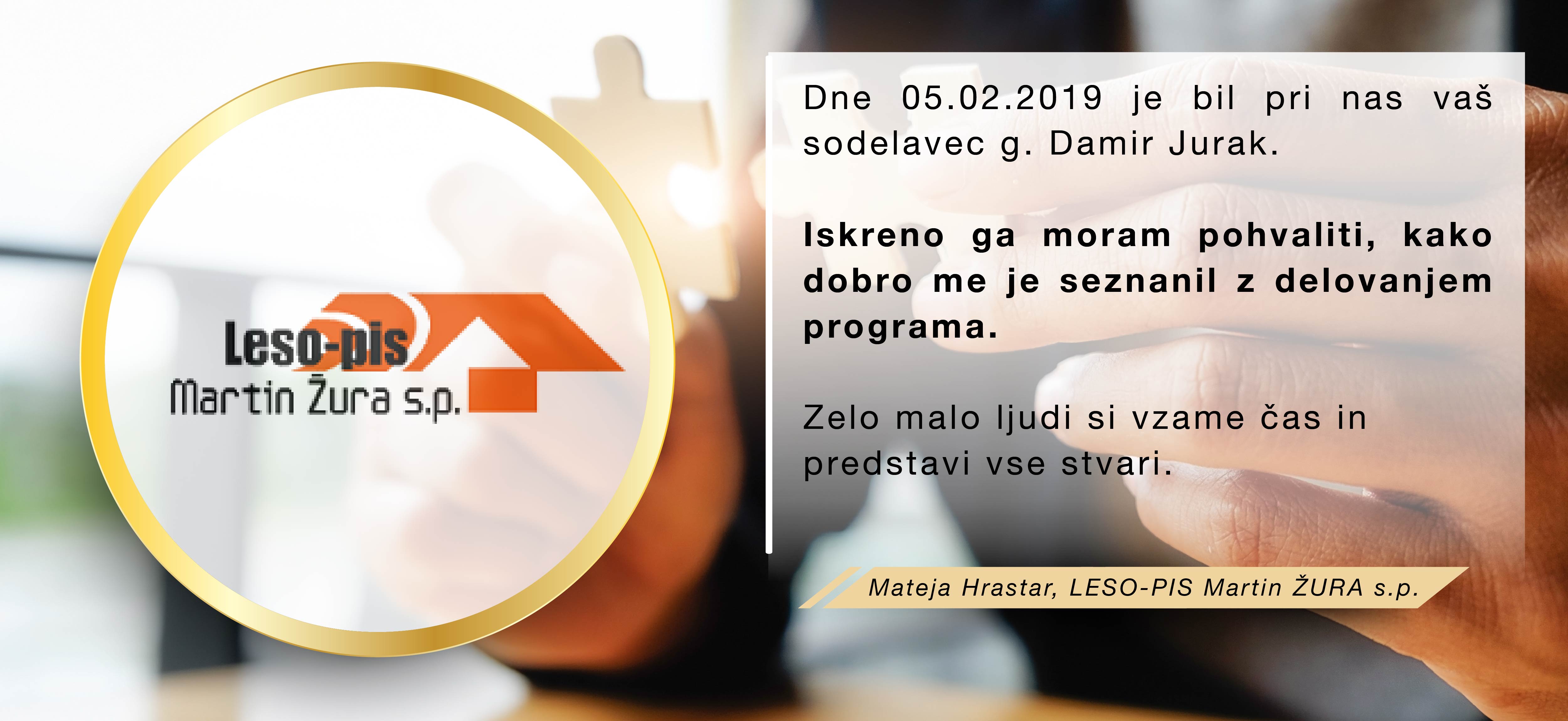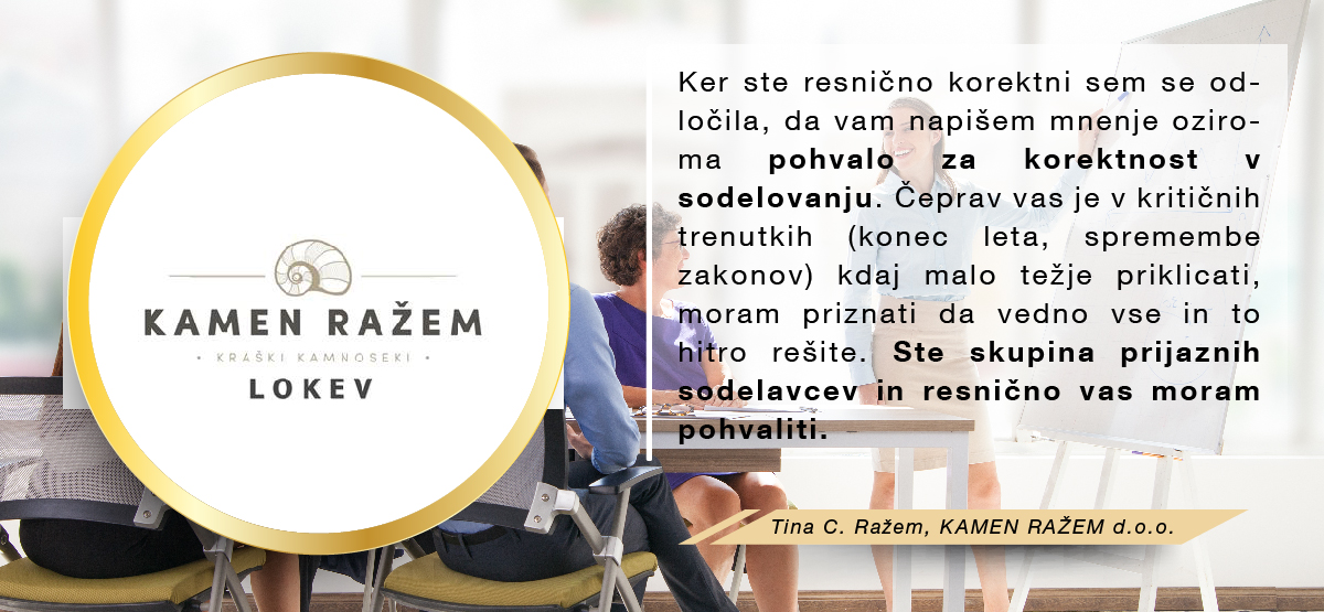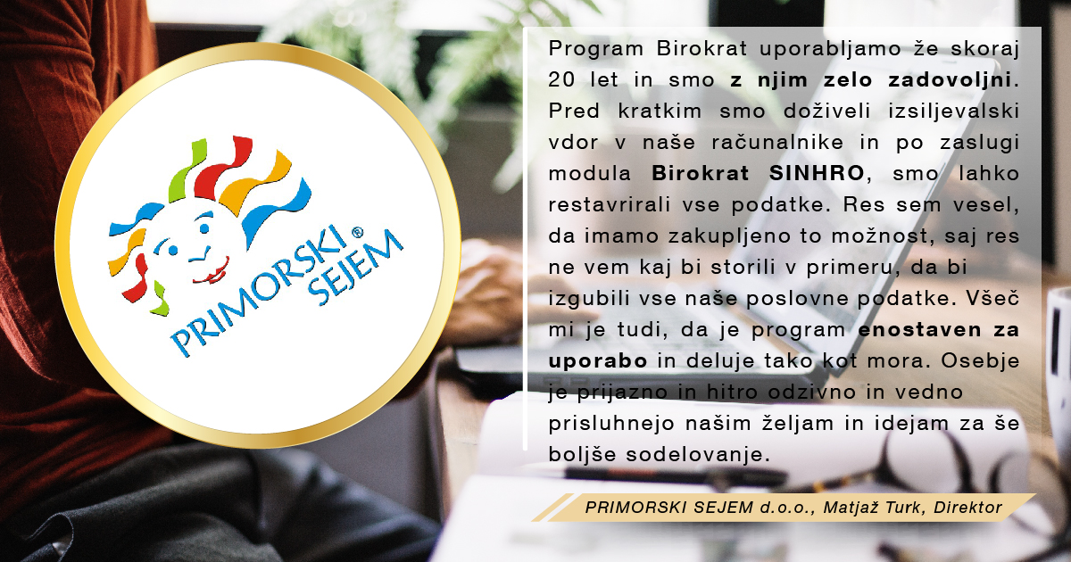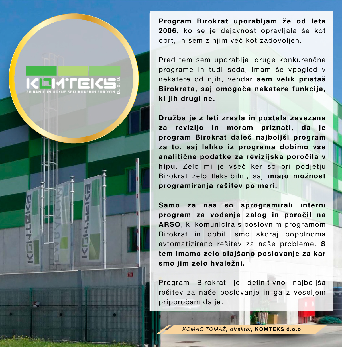 Program Birokrat uporabljamo že od  leta 2001 in smo z njim zelo zadovoljni. Program je  enostaven in prijazen za uporabo, je zanesljiv in ažurno dopolnjen z zakonskimi spremembami. Všeč nam je, ker ima veliko opcij, možnih načinov pregledov in analiz, ki jih stranke rabijo pri svojem nadaljnjem delu. Prav tako so tudi vsi zaposleni v podjetju prijazni in ažurni pri reševanju nastalih težav in problemov. Poleg vsega navedenega pa je program tudi cenovno ugoden in ga z veseljem priporočamo .