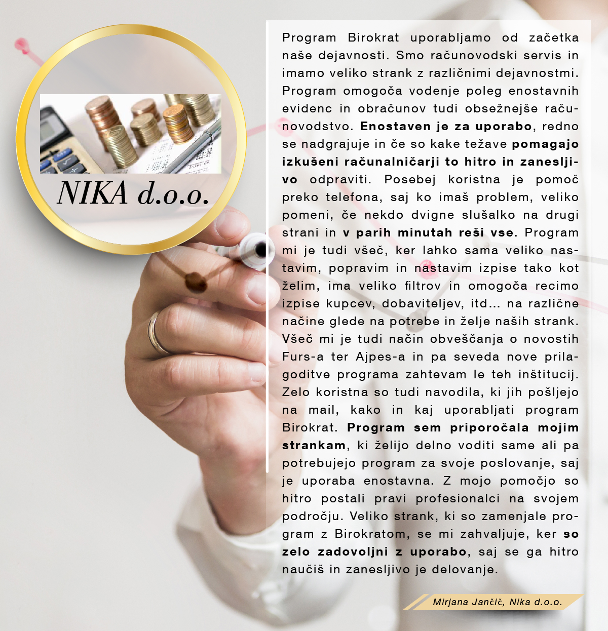 Podjetje Nika investiranje in razvoj d.d. uporablja program Birokrat že od leta 2005. S programom smo zelo zadovoljni. Je enostaven in prijazen uporabniku. Omogoča nam uvoz temeljnic iz excela, kar nam zelo olajša delo, ker ni potrebno vnašati ogromne količine podatkov ročno. Veliko knjižb je avtomatičnih, kar tudi zelo olajša delo v računovodstvu. Program se ažurno posodablja in prilagaja spremembam zakonov. Odzivnost in pripravljenost pomoči preko telefona je hitra in ažurna. Birokrat bi toplo priporočala vsem, ki ga še nimate.