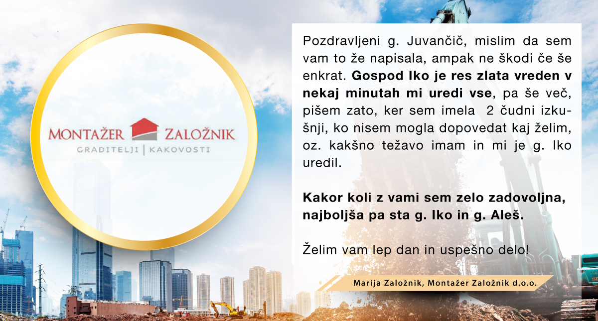Iskreno se vam zahvaljujem za vso pomoč pri namestitvi programa in natančni in jasni razlagi kako zadeva deluje, predvsem pa za vašo potrpežljivost. Da ste mi dali neomejeno število možnosti, da vsakokrat preverim, če sem razumela in mi pri tem niste dajali občutka, da vam je to odveč ali da je z mano karkoli "narobe", ker "tega in tega" ne obvladam. Izjemno pozitivna izkušnja z delom z računalnikom. Prijetno presenečena.