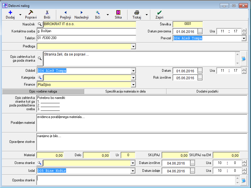 kjer vpišete opis zahtevka stranke kot ga poda pooblaščena oseba, se pravi predstavite težavo stranke ter kaj okvirno je potrebno narediti. Vpišete kateri material naj bi bil porabljen za izvršitev delovnega naloga in okvirno porabljeno delo.