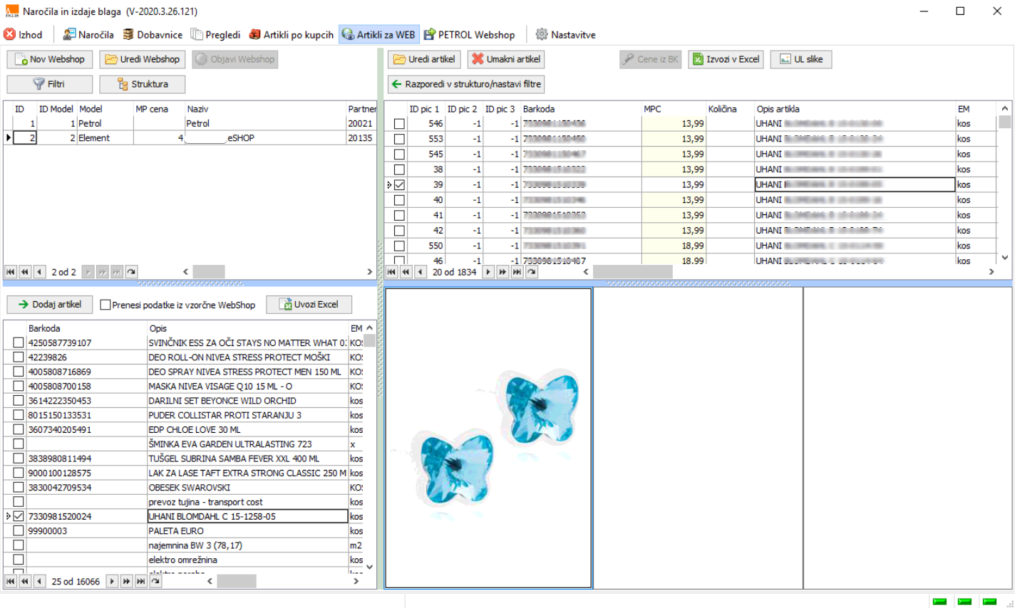Program je namenjen hkratnemu vodenju večih spletnih trgovin, pripravi in urejanju prodajnih artiklov ter spremljanju naročil iz spletnih trgovin Elementa in Petrola. Asortiman artiklov in njihove cene so definirane ločeno za različne trgovine, naročila pa so vodena enotno in barvno kategorizirana glede na status obdelave. Glede na naročila vaših kupcev vam prikazuje artikle posameznega naročnika na nivoju njihovih poslovalnic. Za potrebe vaših poslovnih partnerjev, pa enostavno pripravi strukturiran izvoz podatkov za njihovo nadaljnjo uporabo. Avtomatsko osveževanje podatkov o artiklih, slikah in podatkih o zalogi lahko izvajate ročno ali glede na zastavljen urnik.